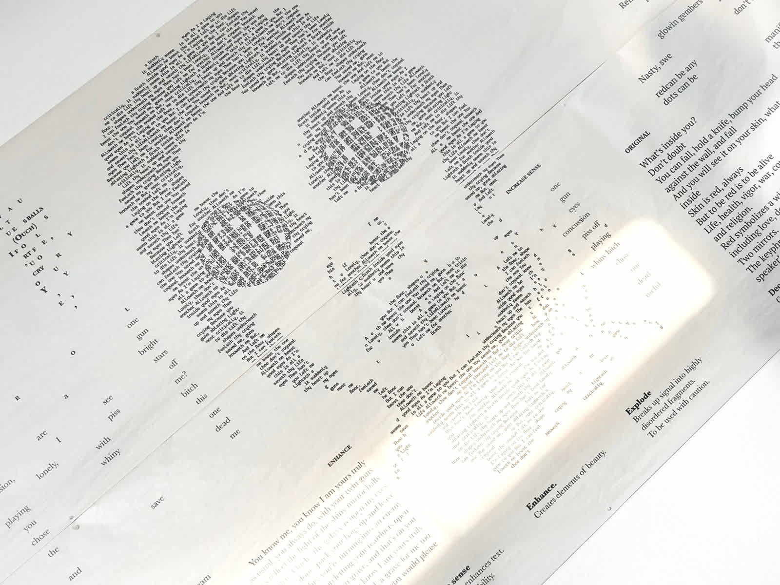 Concept started with Rolf Schoeber's workshop 'Remixing Coincidence' (Change is REPOW). Poetry in collaboration with Carolina Capitulo Teixeira Marques, Jara Hermanns, Atousa Rastegar, Isabel van de Stadt, Laura Simon, Xinyue Wan. Typographical Portrait by me